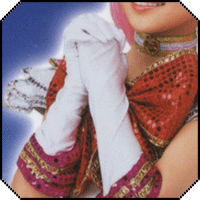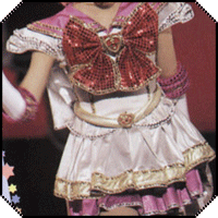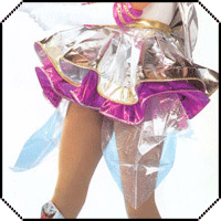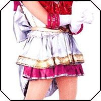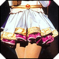 As you can see, in the late myu the skirts are a bit different. First of all, they no longer look like they're wired to hold their shape, and the pleats now appear to be knife pleats. As for color, both skirts are now primarily a white or light gray lamé. The bottom skirt has an additional panel of magenta sewn on at the bottom and trimmed on both the top and bottom by decorative silver stitching. The top skirt has a similar additional panel only this is in gold and it is trimmed with gold decorative stitchin on both the top and the bottom.