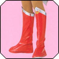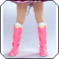 The boots are pink vinyl and to the knee. They still look like sewn on boot covers. The top of each boot sports silver lamé trim in the traditional upside down V shape. On the front of each boot is a large golden crescent moon. The boots do not have visible heels.