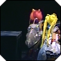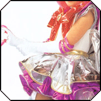 Super Sailor Chibimoon actually ends up in two different costumes in the Myu. The first she wears in all the Anza and Fumina Moon musicals, the second style she wears in the Miyuki and Marina musicals. Our models today are Tamaki Dia Shiari, Kawasaki Mao, and Gunji Ayano for the old style Myu and Gunji Ayano and Oosaki Moe for the later style Myu.