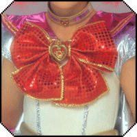 The tiara is the exact same tiara as on the regular myu Chibimoon fuku, so read that summary for my notes on that. Note it has a big pink marble as the accent, not a golden crescent moon, as in the other forms of this fuku. The earrings are gold post studs with danging crescent moons on them. Each crescent moon has three sequins on either side of it. The choker is silver lamé (when it appears to be any other color in the other images that's just because it's reflecting the color of other parts of the fuku, like the very magenta collar) edged in what appears to be either gold lamé or simply wide decorative gold stitching. The accent piece is a smaller version of the brooch on her chest.
