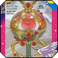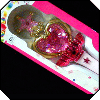 Released among the Sailormoon S toys was sailor Chibimoon's weapon, the Pink Moon Stick. It promises to make you as effective a warrior as Sailor Chibimoon. Expect Pink Sugar Heart Attack to work for you just about as often as it does for her, if not more frequently. It also plays sounds and flashes lights, as appropriate for Pink Sugar Heart Attack.