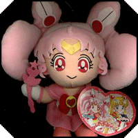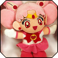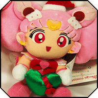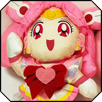 Chibimoon and Pink Moon Stick (Felt), 7.4 in. This is from a special Sailormoon S Chibimoon set. Chibimoon should be carrying a felt Pink Moon Stick, but it has gone missing in this image, while the second image has lost her tiara's jewel. There is a variation in this set: a second Sailor Chibimoon doll with a closed mouth smile. They both carry felt Pink Moon Sticks and have cloth brooches. Their tags are heart-shaped.