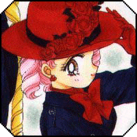 Manga Chibiusa. Adorable thick curl ringlets, one on each side. Hair to chin. Considering the hat, I'd say she's without odango. It's just the pony tails.